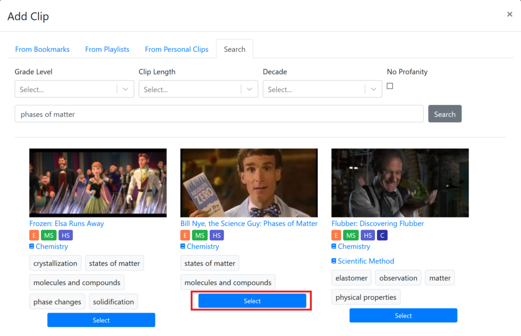 Once you’ve found a clip, you can click the Select button next to or under the clip to add it to the discussion. You can add as many clips as you’d like to your queue to be shown in the discussion. You can also reorder the clips by dragging & dropping them.
